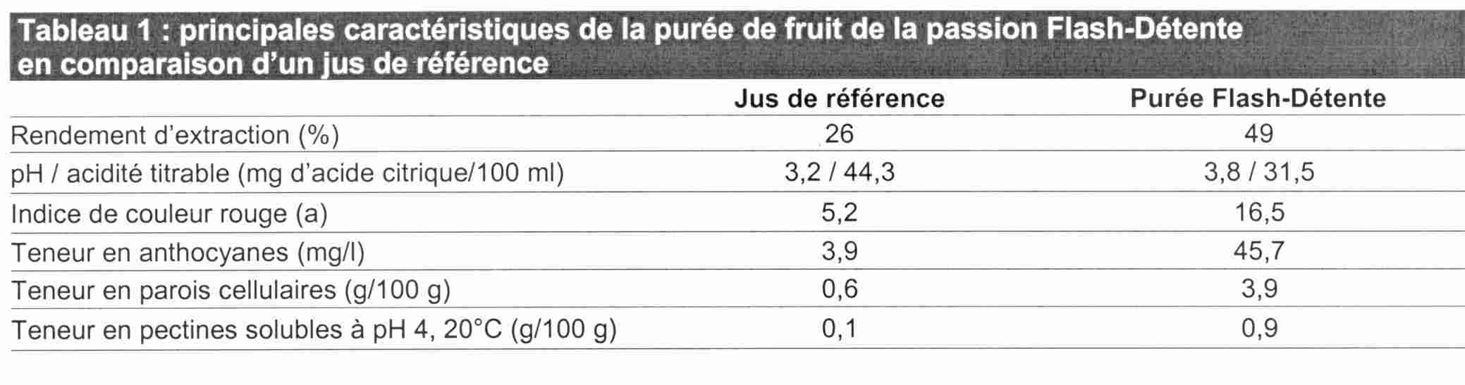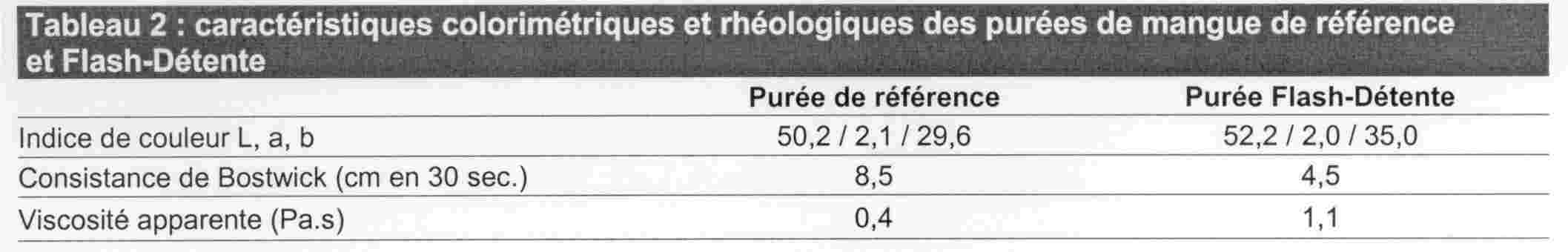 ![]() Purée de mangue Seul le mésocarpe de ce fruit, constitué essentiellement de cellules parenchymateuses, subit des bouleversements cellulaires propres à ce procédé. L'épicarpe très rigide, particulièrement riche en lignine, n'est pas dégradé par ce procédé. Les paramètres physico-chimiques classiques (pH, acidité titrable, etc.) d'une purée obtenue par le procédé de Flash-Détente seront donc proches de ceux d'une purée traditionnelle. La perte de l'organisation cellulaire des cellules parenchymateuses et l'explosion d'une partie des cellules provoquent par contre des changements d'ordre rhéologique : les produits obtenus ont une consistance et une viscosité nettement plus élevées (tableau 2). ![]() Le traitement par le vide (2ème étape du procédé) permet de réduire considérablement la teneur en oxygène du produit (1/5ème de la teneur initiale) et donc de limiter au maximum les phénomènes de brunissement oxydatif. La purée de mangue obtenue par Flash-Détente a ainsi une couleur plus claire et plus jaune, corrélée à l'augmentation des indices L et b du chromamètre (tableau 2). Extraction des huiles essentielles d'agrumes L'introduction d'écorces d'agrumes (pomelo, orange, mandarine, citron), préalablement étuvées dans la chambre de vide, provoque l'explosion des glandes à huiles essentielles contenues dans le flavedo (partie colorée externe du fruit). Les huiles seront donc vaporisées simultanément à une partie de l'eau présente dans les écorces. Après condensation, les huiles seront récupérées sous forme d'émulsion aqueuse, puis purifiées par centrifugation. Les rendements d'extraction obtenus à partir d'écorces de citron, d'orange, de mandarine et de pomelo sont respectivement égaux à 44, 29, 33 et 27 %. Après déterpénisation, les huiles essentielles extraites par le procédé de Flash-Détente sont de qualité supérieure à des huiles fraîchement pressées avec des proportions relatives supérieures en aldéhydes mono- et sesqui-terpéniques. Un procédé multi-usage Les fruits Des purées plus consistantes et plus visqueuses ayant une intensité colorante supérieure sont obtenues, autorisant un ratio de dilution supérieur dans un but d'élaboration de nectars (purée après dilution). Ces caractéristiques rhéologiques particulières sont dues, selon le cas, à une teneur supérieure en parois cellulaires et en pectines solubles dans la purée, mais aussi à la désorganisation cellulaire engendrée par l'effet de détente. Après dilution, des nectars plus stables sont produits, ayant une séparation de phase plus lente. L'étape de blanchiment assure une inhibition quasi totale de l'activité enzymatique endogène (polyphenoloxydase, pectinemethylesterase), tandis que la viscosité supérieure du produit diminue les phénomènes de chute du trouble dans le produit fini. Une très faible teneur en oxygène est mesurée dans les produits après détente, limitant en ce sens les phénomènes d'oxydation et donc de brunissement. Les purées après pasteurisation conservent une couleur vive, même après plusieurs mois de conservation. Le broyage fin de toutes les parties du fruit, et en particulier des zones parenchymateuses, engendré par la phase de détente permet d'obtenir en final des rendements de production supérieurs (cas du fruit de la passion). Les huiles essentielles Les huiles essentielles obtenues à partir d'écorces d'agrumes traitées en Flash-Détente sont qualitativement proches de celles obtenues par pressage à froid. Les rendements sont égaux, voire supérieurs, à ceux obtenus par un procédé classique type F.M.C. Ce procédé permet donc de valoriser les écorces d'agrumes qui n'ont actuellement qu'un intérêt économique faible. Applications annexes Procédé de concentration Environ 10 % de la masse de fruits introduite dans la chambre de chauffe sont récupérés sous forme d'eaux aromatiques (eaux d'évaporation condensées). Procédé de désodorisation Certains légumes dégagent une odeur nauséabonde à la cuisson par volatilisation de composés soufrés (par exemple : choux). Le traitement préalable de ces légumes par le procédé de Flash-Détente permettrait de piéger tout ou partie des composés volatils nauséabonds. Faciliter l'extraction de molécules fonctionnelles De nombreux fruits sont riches en molécules fonctionnelles intéressantes de type carotènes ou lycopènes. Le broyage intime et l'explosion d'une partie des cellules permettraient d'augmenter les rendements d'extraction de ces molécules.