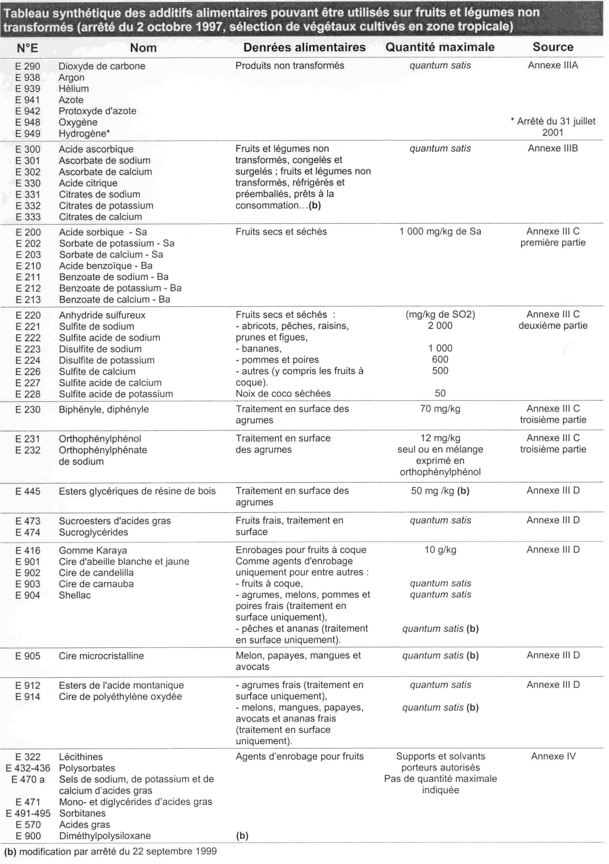 On peut noter que les produits phytopharmaceutiques ne sont pas repris dans le texte de l'arrêté du 4 octobre 1997. La particularité des traitements post-récolte est mise en relief par le maintien d'un chapitre qui y faisait référence dans l'arrêté de 1991 : " 7. Les dispositions de l'arrêté du 14 octobre 1991 modifié susvisé sont abrogées en ce qu'elles concernent les additifs alimentaires, exception faite ( ) et des dispositions relatives à l'emploi des produits de traitement après récolte suivants : chlorprophame, imazalil, sulfate d'imazalil, nitrate d'imazalil, diphénylamine, bénomyl, éthoxiquine, éthylène et thiabendazole dans les pommes de terre (en liaison avec l'arrêté du 5 août 1992 susvisé).". Cette situation est transitoire et préfigure la nette distinction des deux types de produits, comme cela est prévu par la directive européenne relative aux additifs alimentaires 95/2/CE : " considérant que, dans l'attente de dispositions spécifiques prises en application de la directive 91/414/CEE du Conseil, du 15 juillet 1991, concernant la mise sur le marché des produits phyto-pharmaceutiques et de la directive 90/642/CEE du Conseil, du 27 novembre 1990, concernant la fixation de teneurs maximales pour les résidus de pesticides sur ou dans certains produits d'origine végétale, y compris les fruits et légumes, certaines substances appartenant à cette catégorie sont provisoirement couvertes par la présente directive. ". La présence de références aux produits phytopharmaceutiques pouvant être utilisés en traitement post-récolte dans deux catégories de textes différents complique l'interprétation de ces textes. Les informations relatives à l'évolution des autorisations de mise sur le marché ne font d'ailleurs pas systématiquement l'objet d'une parution au Journal officiel et une recherche d'information devra tenir compte du catalogue des produits autorisés publié par la DGAL, qui seul fourni une information régulièrement mise à jour. Certains arrêtés plus spécifiques peuvent compléter les textes à large portée. Dans le cas des fruits tropicaux, un arrêté concerne le litchi, un fruit présentant une coque non comestible. Il reprend les informations relatives à l'usage du SO2 et précise que la teneur résiduelle dans la coque peut atteindre 250 mg/kg (arrêté du 1er juillet 1998 portant autorisation d'emploi des sulfites en tant qu'auxiliaires technologiques pour le traitement après récolte des litchis et des raisins de table). Les traitements par rayonnements ionisants La prolongation de la durée de conservation de fruits ou légumes, leur désinsectisation ou leur décon-tamination microbienne peuvent également être obtenues par exposition aux rayonnements gamma du Cobalt 60 ou du Césium 137 ou aux faisceaux d'électrons d'une énergie inférieure ou égale à dix millions d'électrons-volts (10 Mev). Trois textes réglementent l'utilisation de ces techniques pour les fruits secs et légumes secs, pour les fraises et pour les herbes aromatiques surgelées telles que l'ail, la ciboulette, le cresson de fontaine, l'estragon et le persil (arrêté du 6 janvier 1988 relatif au traitement par rayonnements ionisants des légumes secs et fruits secs, arrêté du 29 décembre 1988 relatif au traitement par rayonnements ionisants des fraises et arrêté du 16 mai 1990 relatif au traitement par rayonnements ionisants des herbes aromatiques surgelées). Les dispositions relatives à la mise en uvre de ces techniques s'appliquent quel que soit le pays où s'effectue le traitement. En cas d'importation, l'importateur doit être capable de justifier que les traitements ont été effectués dans les conditions prévues par la réglementation française (certificat, tenue de registre, etc.). Dans ce cas précis, contrairement aux traitements post-récolte utilisant des produits phytopharmaceutiques, il est demandé aux importateurs de justifier précisément des techniques utilisées, même si le traitement a lieu dans un pays tiers. Les traitements spécifiques à l'élimination des organismes de quarantaine Dans le cadre des mouvements commerciaux de produits d'origine végétale, les Etats sont amenés à prendre des mesures phytosanitaires permettant la protection de leur territoire face à des organismes nuisibles susceptibles de provoquer des dégâts sur leur territoire. La lutte contre les organismes de quarantaine prévoit un certain nombre de traitements permettant d'éliminer ces organismes des lots de fruits et légumes lorsqu'ils présentent un risque (traitements préventifs) ou lorsque des organismes ont été détectés (traitements curatifs). La fumigation permet un contrôle très efficace des insectes, ce qui permet son utilisation dans le domaine de la problématique de quarantaine. Pour cela, des matières actives à toxicité importante sont utilisées. Elles doivent l'être dans un cadre strict, défini par la réglementation :